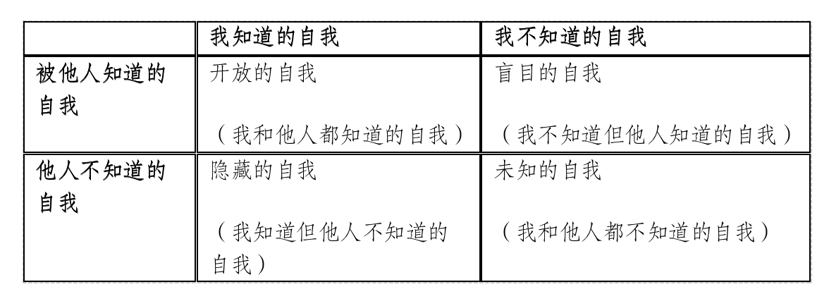 每个人的自我都有不同的部分。有的一部分是我和周围人都了解的,像我的姓名、性别、年龄、职业和明显的个性等,这被称为“开放的自我”。还有的部分就只有我自己知道,比如我保守的秘密,这被称为“隐藏的自我”。