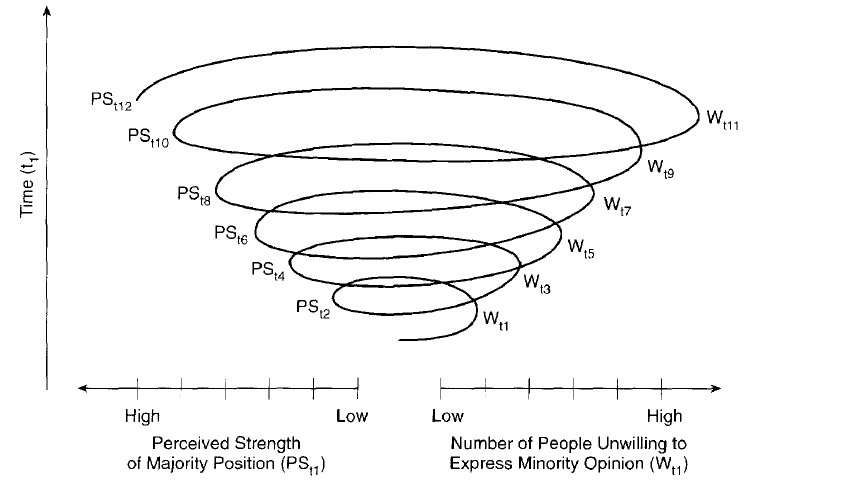 在意见气候的压力之下,那些与大众传媒代表的多数意见一致的人,敢于在公开场合大胆地表达自己的意见(speak out),相反,在媒介中缺乏代表的意见则成为所谓“少数意见”,赞成它们的人害怕被社会孤立而保持沉默。这两个趋势在社会中不断扩散,一方的声音越来越大,另一方的声音越来越小,就形成了沉默的螺旋。