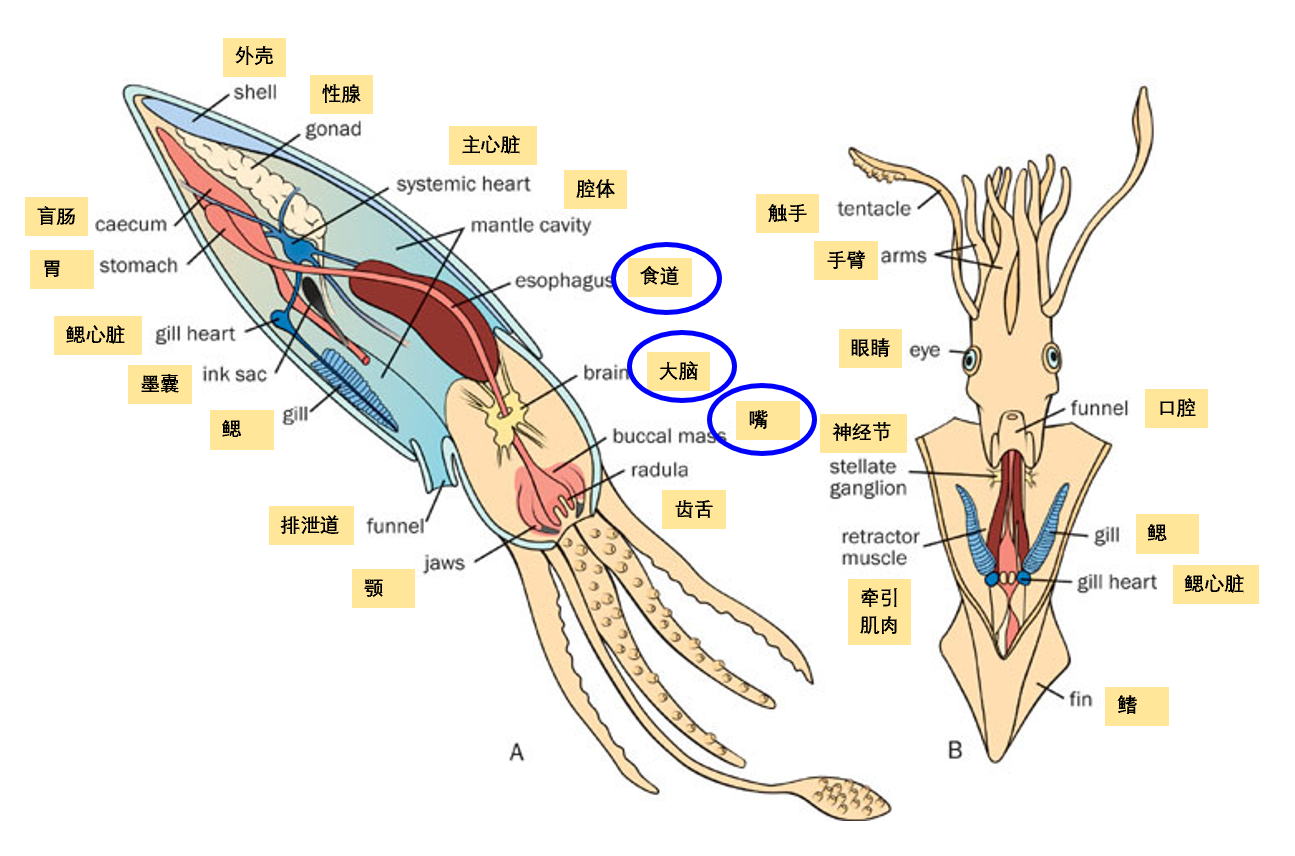 比如说乌贼,它和人和身体完全不一样。人的内脏都在头的下面,但是乌贼是反过来的,内脏在头的上面。而且乌贼是倒着走的。乌贼也没有骨头,没有形状。